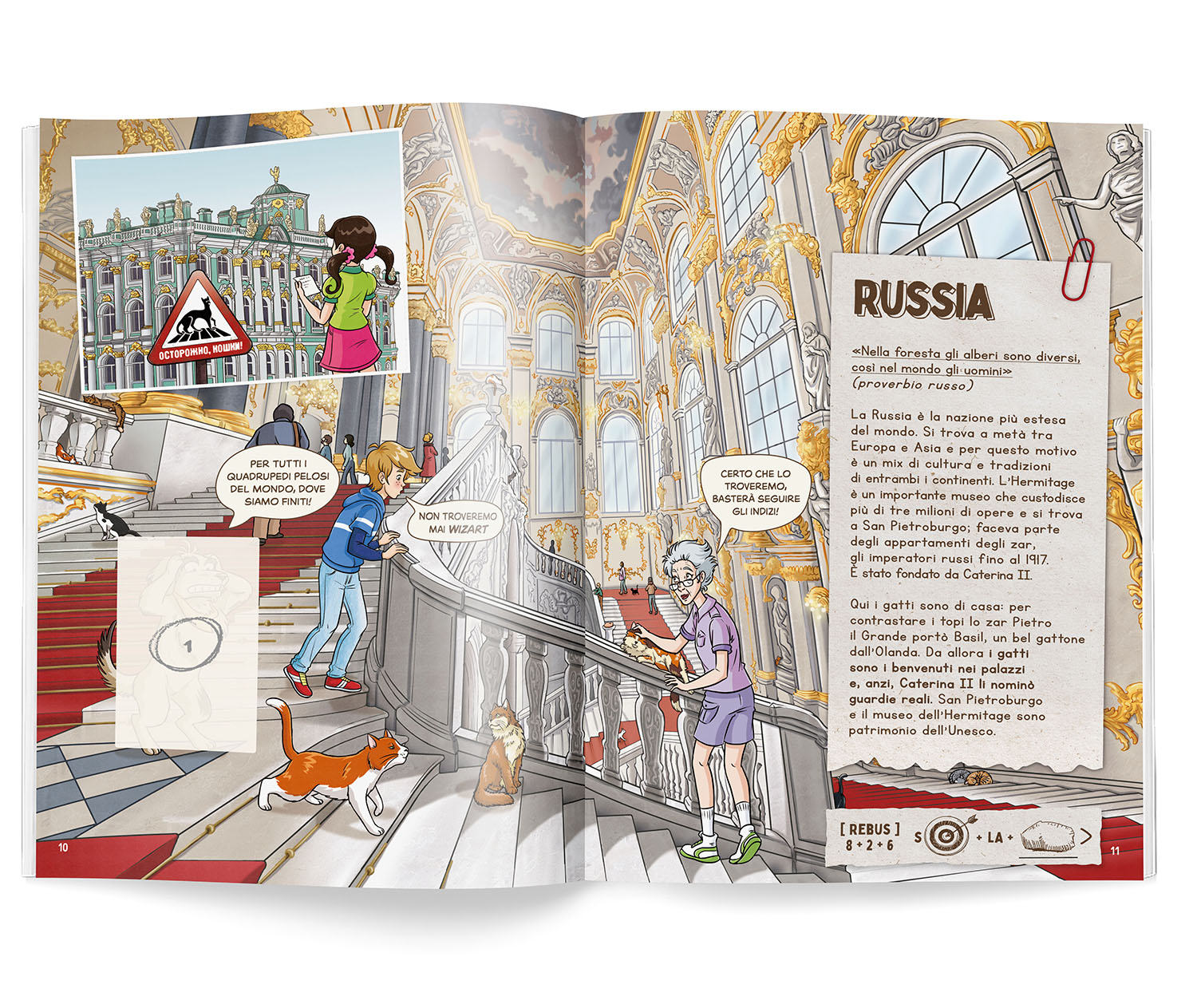 Dopo l’incredibile successo della prima collezione e del secondo album dedicato al primo Novecento, con la terza collezione, Tutto Mondo, gli Artonauti partono per un viaggio che a tutti noi oggi è proibito, un giro del mondo alla scoperta dei continenti, dei loro tesori artistici e delle loro incredibili architetture. Il titolo Tutto Mondo, che esprime un senso di collettività e di unione, è un omaggio all’omonima opera di Keith Haring dedicata proprio all’umanità intera, che l’artista dipinse sul muro esterno della Chiesa di Sant’Antonio a Pisa. È anche un vero e proprio neologismo – come del resto lo è anche il termine Artonauti – che vuole ricordare il modo fantasioso e originale di parlare dei bambini. La storia del terzo album Artonauti Tutto Mondo inizia con una scena molto attuale: i bambini protagonisti del racconto – Ale e Morgana – stanno seguendo le lezioni online da casa. All’improvviso scompare il simpatico gatto cicciottello Wizart (chiamato così in omaggio alla casa editrice che ha creato Artonauti!) e i nostri eroi partono alla sua ricerca accompagnati dalla nonna Artemisia e dall’inseparabile Argo, il cane vero protagonista della storia e narratore delle vicende. Tutti insieme viaggeranno per il mondo partendo dalla Russia e attraversando l’Asia fino al Giappone, esplorando l’Australia e l’Africa, per arrivare in America latina dove risaliranno il continente per poi fare ritorno in Europa. Avranno modo di conoscere le culture più distanti e i monumenti più famosi sparsi per il globo: il Taj Mahal in India, gli scavi archeologici in Siria, ma anche l’arte aborigena australiana, i grandi murales in Brasile, raffinate architetture persiane e coloratissimi dipinti della giungla centroamericana e gli artisti contemporanei in Africa. Non ci sono vincoli cronologici in questo viaggio dove ogni paese rivela le proprie peculiarità e caratteristiche e il cui punto d’arrivo è la Nascita di Venere di Botticelli, emblema del Rinascimento e della storia dell’arte dell’Italia e del mondo. Inoltre alla fine dell’avventura, ritrovando il gatto Wizart, i personaggi scopriranno il messaggio segreto dell’album decifrando un antico linguaggio sumero.