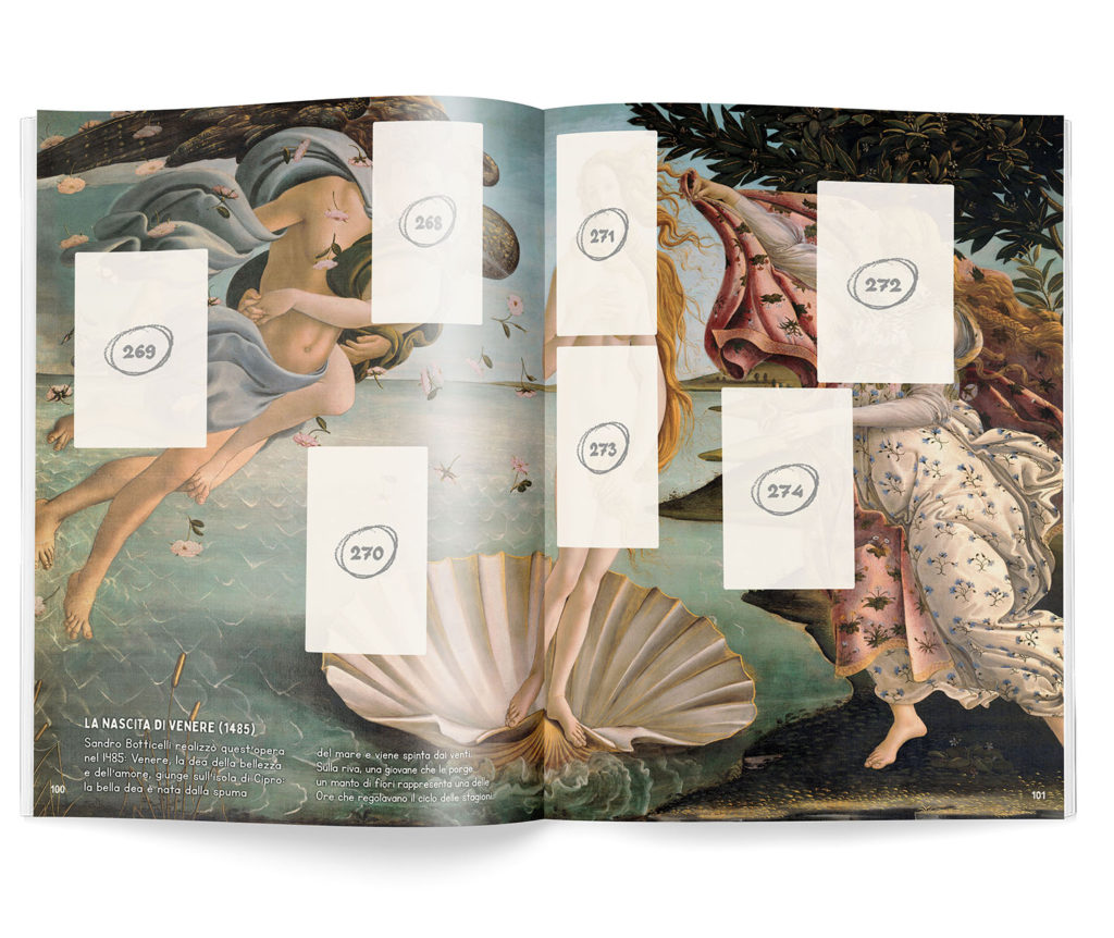 Alcuni degli artisti presenti in questa collezione: Canova, Rubens, Tiziano, Raffaello, Natalia Goncharova, Diego Rivera, Frida Kahlo, Andy Warhol, Roy Lichtenstein, Keith Haring, Jackson Pollock, e tanti altri. Quest’album è progettato per i bambini dai 7 ai 14 anni e si compone di 116 pagine, 15 tavole di illustrazione, ben 99 tra opere d’arte e monumenti da ricostruire grazie alle 288 figurine.