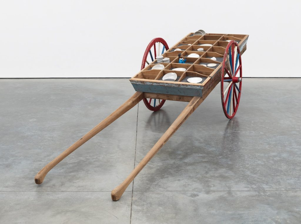 Theaster Gates – Rickshaw for Fossilized Soul Wares, 2012 – Wood, cast black concrete, clay, and plastic. © Theaster Gates. Courtesy the artist and White Cube.