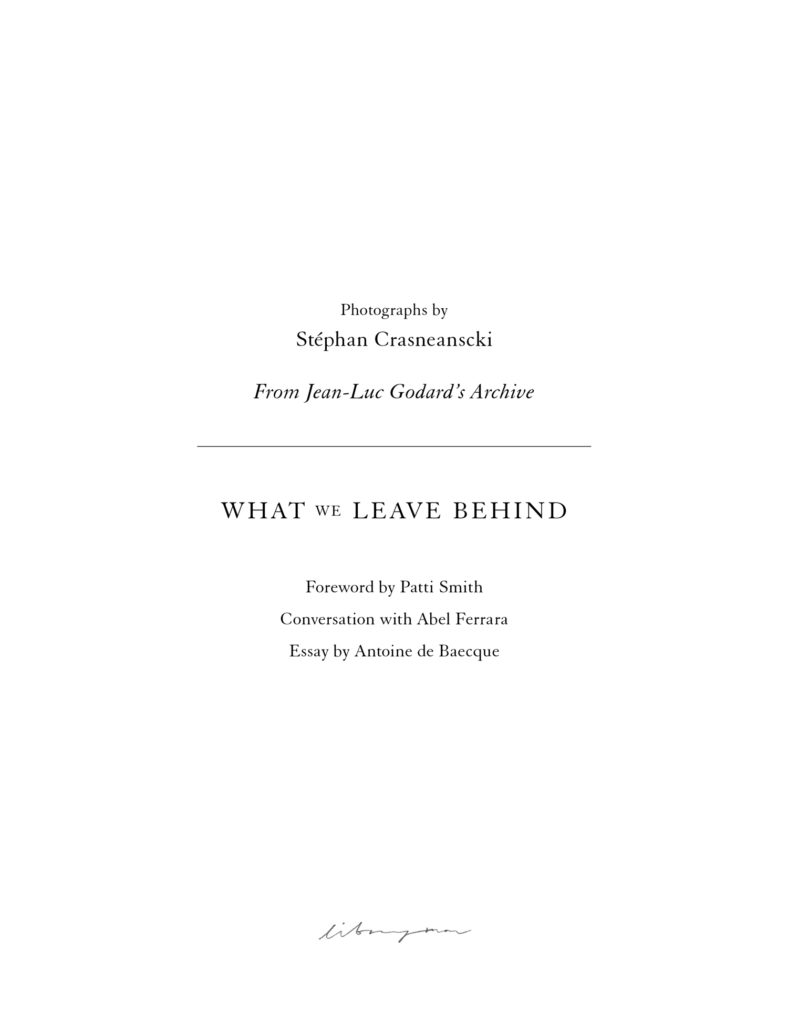 From Jean-Luc Godard’s Archive. Stéphan Crasneanscki – What We Leave Behind. The book contains a foreword by musician, author and poet Patti Smith (b. 1946, American), a conversation with filmmaker Abel Ferrara (b. 1951, American) and an essay written by film critic, historian and editor Antoine de Baecque (b. 1962, French).
