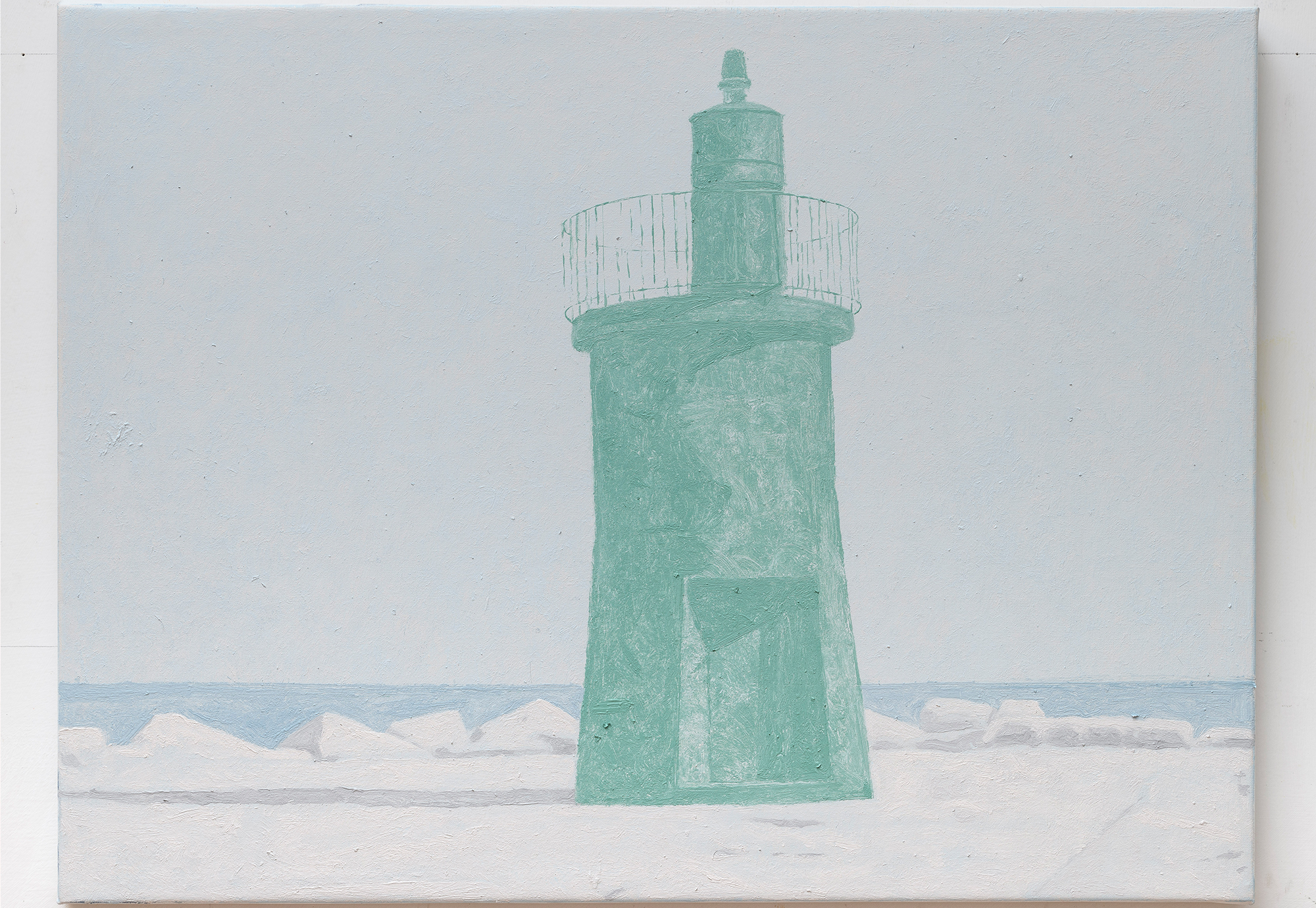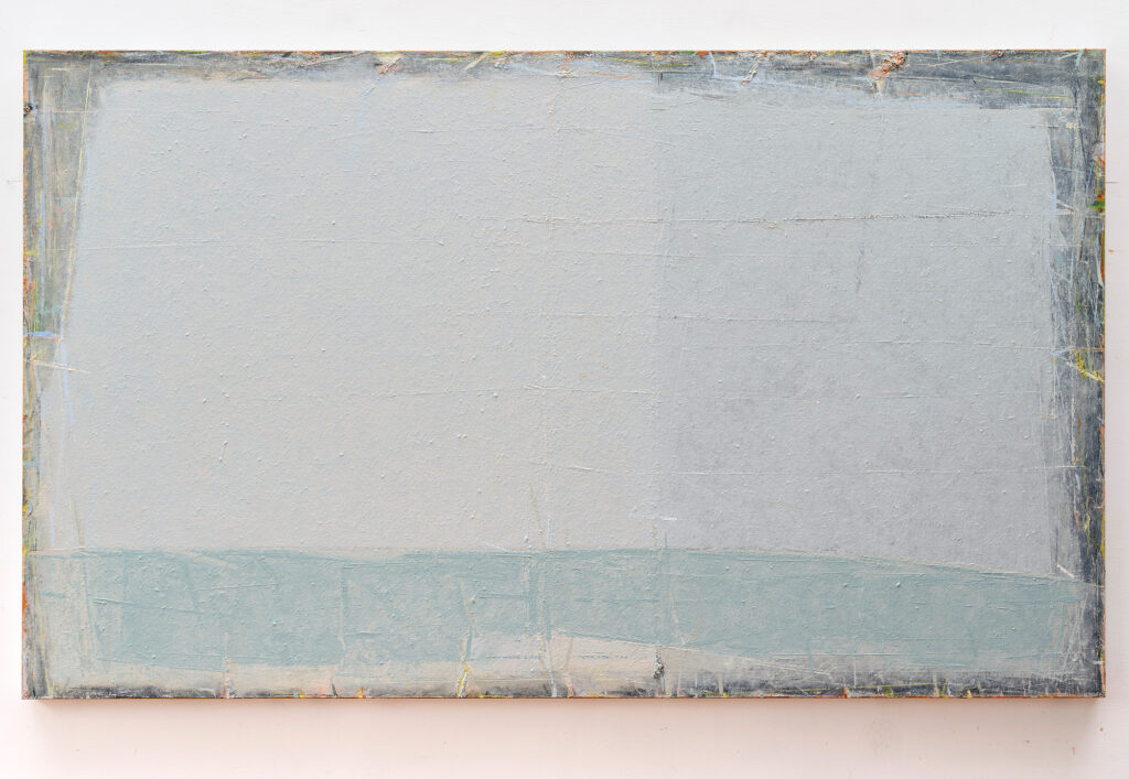 Nella sua pittura salina, il paesaggio lentamente svapora. La linea d’orizzonte sembra estendersi in un infinito ovattato, “la vastità dell’orizzonte nella sua monotonia non è che un fondale dove depositare il pensiero” commenta Elisa Fulco.